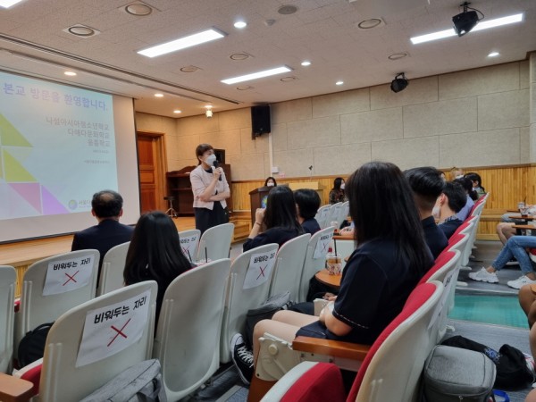 서울다솜관광고등학교의 교감선생님의 환영 인사로 시작된 견학은 교무부장 선생님의 진행으로 각종 순서들이 이루어졌습니다.