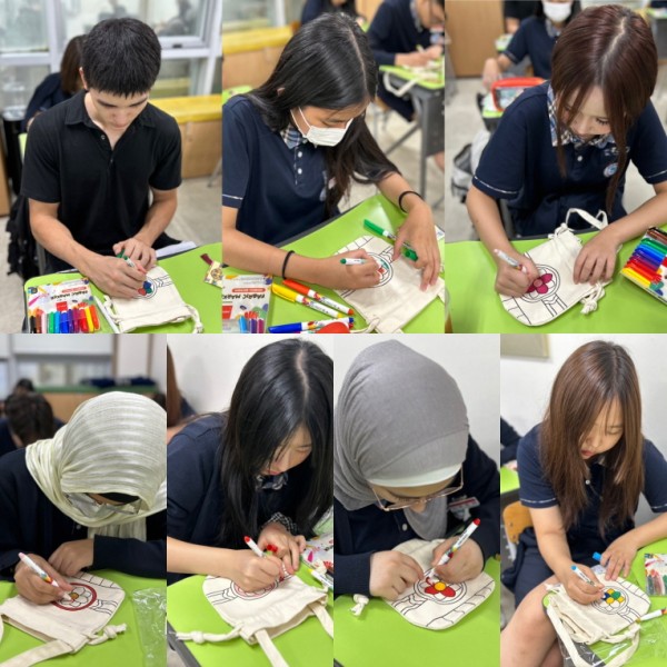 세계 여러 나라의 문화를 배우며 서로의 문화를 이해하고 존중하는 시간인 <글로벌빌리지위크>에서 이번에는 한국의 최대 명절 중 하나인 추석에 대해 알아보았습니다. 한국 전통 목조건축물의 장식인 단청 무늬가 그려진 복주머니 가방을 각자의 개성에 맞게 꾸며보았는데요, 학생들이 만든 복주머니 안에 복이 가득가득 담기는 풍성한 한가위 보내길 바랍니다!