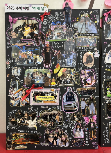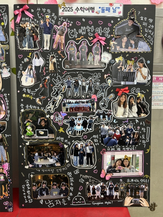 지난 수학여행의 추억을 담은 사진들이 참 많습니다. 특별히 이번 수학여행에는 국민연금공단 세아사 서공석 부장님께서 동행하셔서 학생들 사진을 찍어주시며 재능 기부를 해 주셔서 멋진 사진이 많았습니다. 그 사진으로 일주일간 학생들이 힘을 합쳐 사진 게시판을 꾸며주었습니다. 수학여행에서 즐거웠던 기억들을 다시 한번 꺼내어보며 웃을 수 있는 시간이었습니다.