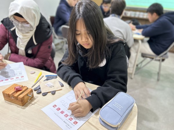 한국의 전통문화를 체험하기 위해 인사동에서 모인 다애학생들, 오늘은 한국의 전통공예인 전각 기술을 체험하기 위해 ‘어라연 전각 연구소’에서 도장에 자신의 이름을 직접 새겨 넣어 보는 시간을 가졌습니다. 중요한 일에는 약속의 의미로 자신의 이름이 새겨진 도장을 찍지요, 그렇기에 먼저 신중하게 도안을 그리고 도장에 하나하나 정성스럽게 이름을 새겨 넣었습니다. 앞으로 이 도장이 학생들의 앞길에서 좋은 곳에 잘 쓰이길 바랍니다.