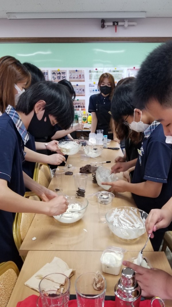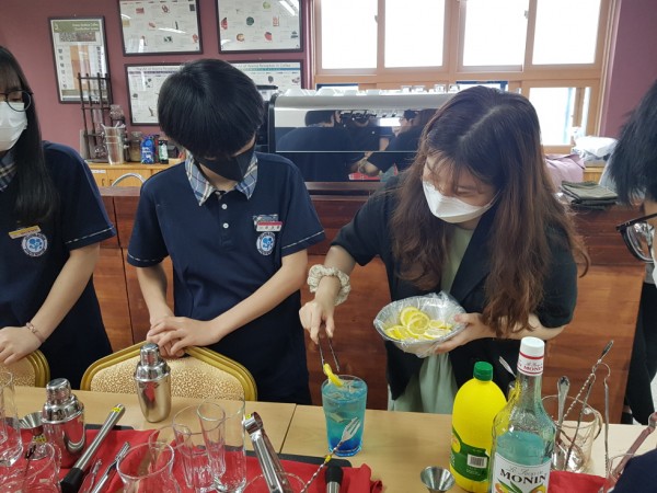 먼저 관광서비스학과에서는 오레오아이스박스를 만들어보는 파티쉐 체험, 4종류의 논알콜 칵테일을 만들어보는 조주사 체험이 있었습니다. 학생들이 만들기 전 선생님께서 먼저 도구 소개와 시범이 있었습니다. 오레오아이스박스는 만드는 방법이 굉장히 쉬워 집에서도 혼자 만들 수 있을 정도였는데요! 크림치즈와 오레오 크림을 잘 섞고 통에 크림과 오레오를 번갈아 가며 예쁘게 담아 냉동실에 넣어줍니다. 그리고 논알콜 칵테일은 블루레몬에이드, 라임모히또, 선라이즈, 피나콜라다를 만들어 보았습니다. 쉐이킹도 직접 해보고, 데코레이션도 하며 다양한 종류의 논알콜 칵테일을 맛 볼 수 있었습니다.