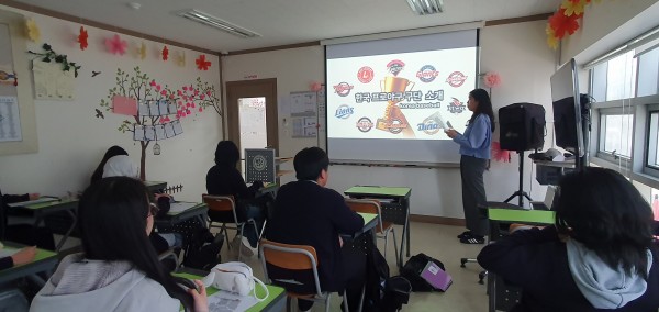 올해도 국민연금공단 서울남부지역본부에서 오셔서 다애학생들에게 다양한 주제로 한국어 수업을 진행해 주십니다. 오늘은 그 첫 시간으로 요즘 대한민국에서 가장 뜨거운 곳인 야구장에서 뛰는 <한국 프로야구 구단>에 대해 소개해 주셨습니다. 야구를 좋아하시는 선생님께서 알려 주시는 각 프로야구 구단의 특징과 차이점들을 알게 되었는데요, 다애 학생들도 5월에 가족사랑캠프로 야구 경기 관람을 준비하고 있는데 야구에 대해 잘 모르는 우리 학생들이 예습할 수 있는 시간이었답니다!