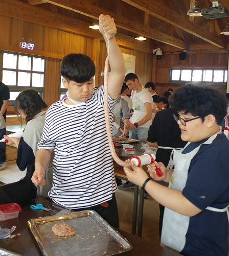 너무 열심히 조개를 캐서 배가 고픕니다. 이번에는 상하농원으로 이동해서 허겁지겁 점심을 먹은 후, 소시지 만들기 체험을 했습니다. 우선 손을 깨끗이 씻고, 고기를 정성껏 치대서 반죽해 준 후, 소시지 건에 고기를 채워 넣고 총을 쏘듯이 누르면 긴 소시지가 순대처럼 쭈욱~ 나온답니다.~ 정말 신기했어요. 체험이 끝난 뒤 농원을 거닐면서 양, 돼지, 소 등 여러 동물들을 만나 인사를 나누었습니다.